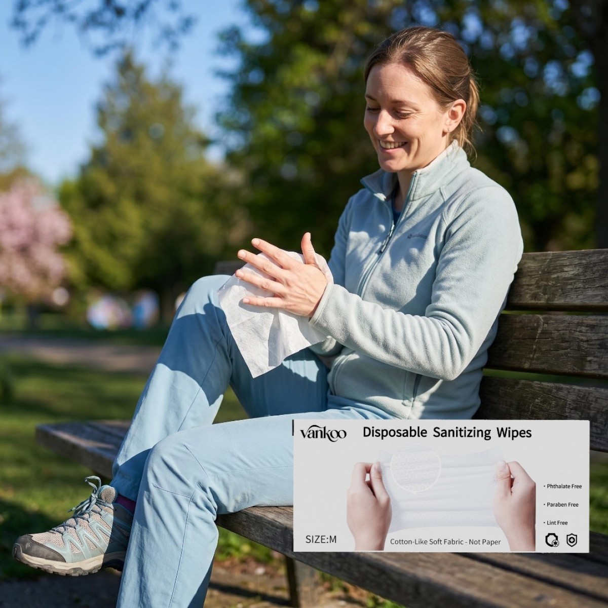 VanKoo Disposable Sanitizing Wipes, M-Size, Cotton-Like Soft & Durable Fabric, Not Paper, Phthalate & Paraben Free, Unscented, Gentle & Effective Cleaning for Hands and Hard Surfaces